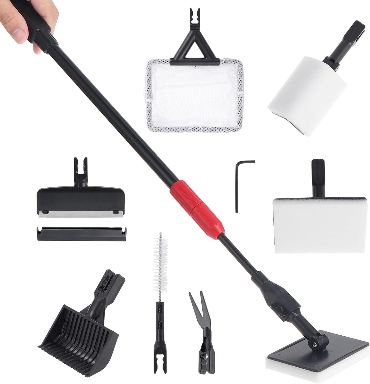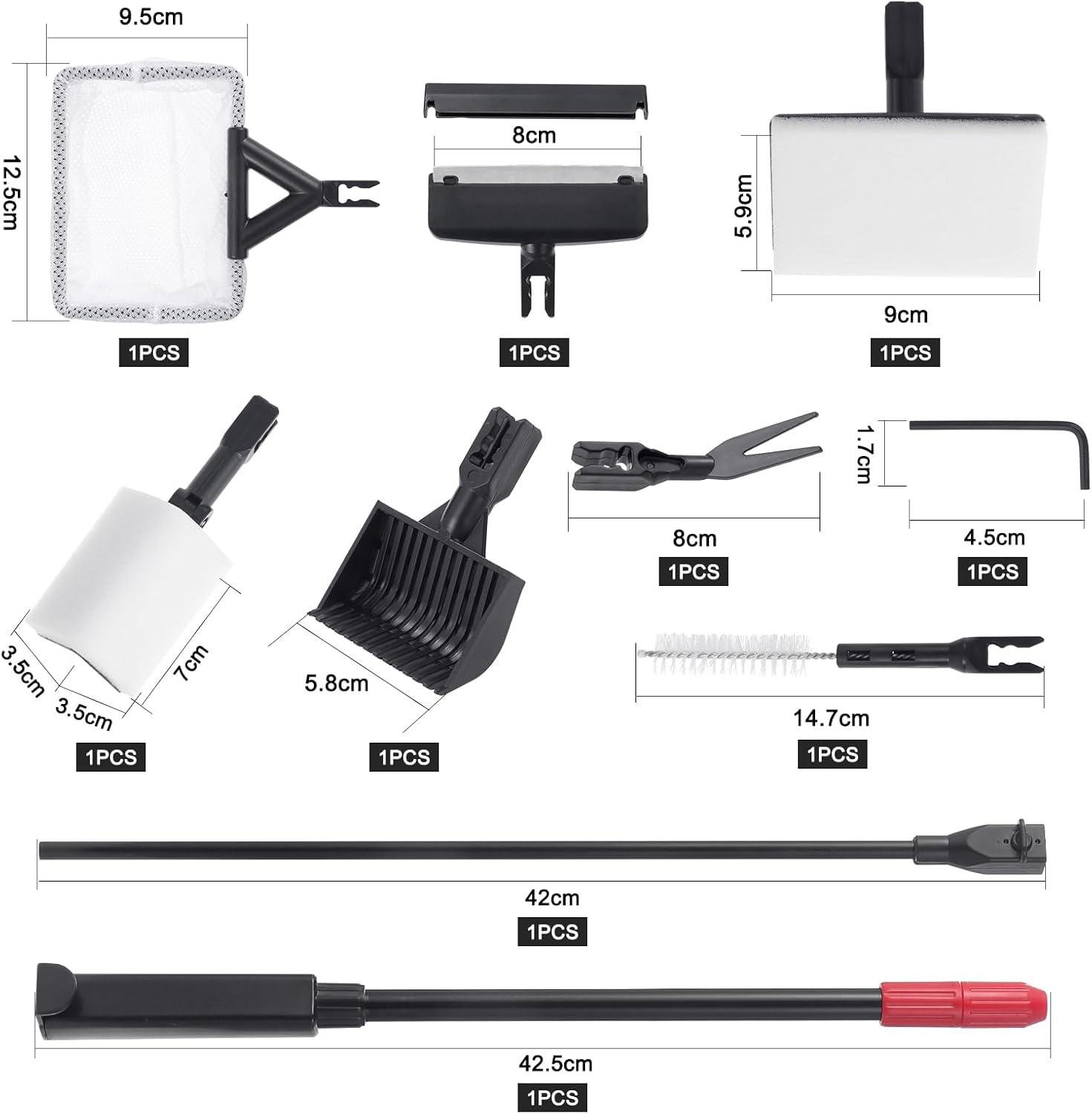 Effective tools: The right angle brush can rotate 180 degrees to clean the dirt in every corner, the stainless steel scraper accessory to clean the hardest things, the pipe brush to clean pipes, the gravel rake for raking and cleaning gravel, the flat sponge for cleaning the substrate and glass, the fishing net to clean some floats in the tubs.